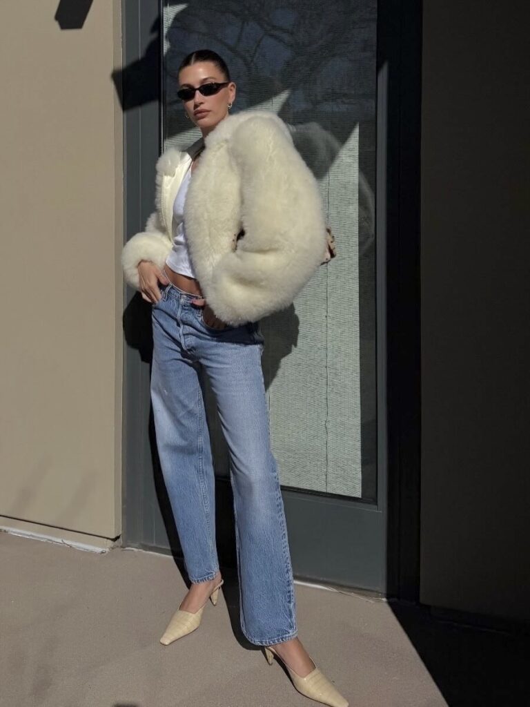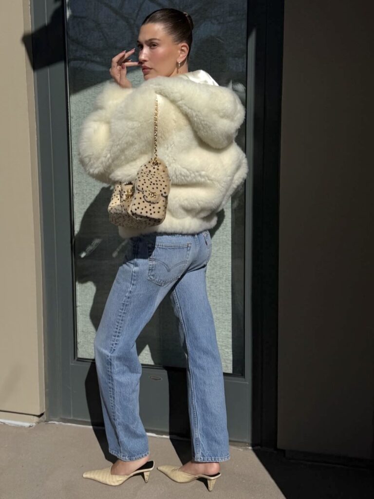 スーパーボウルの会場でキャッチされたヘイリービーバーは、白のファーアウターにデニム、シャネルのバッグを効かせた最新ルックで、サングラス越しのムードまで完璧にまとめてみせた。