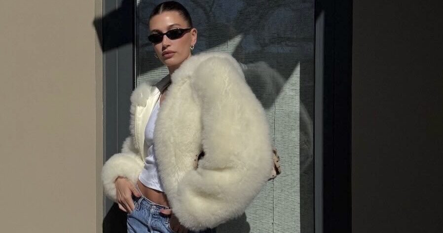スーパーボウルの会場でキャッチされたヘイリービーバーは、白のファーアウターにデニム、シャネルのバッグを効かせた最新ルックで、サングラス越しのムードまで完璧にまとめてみせた。